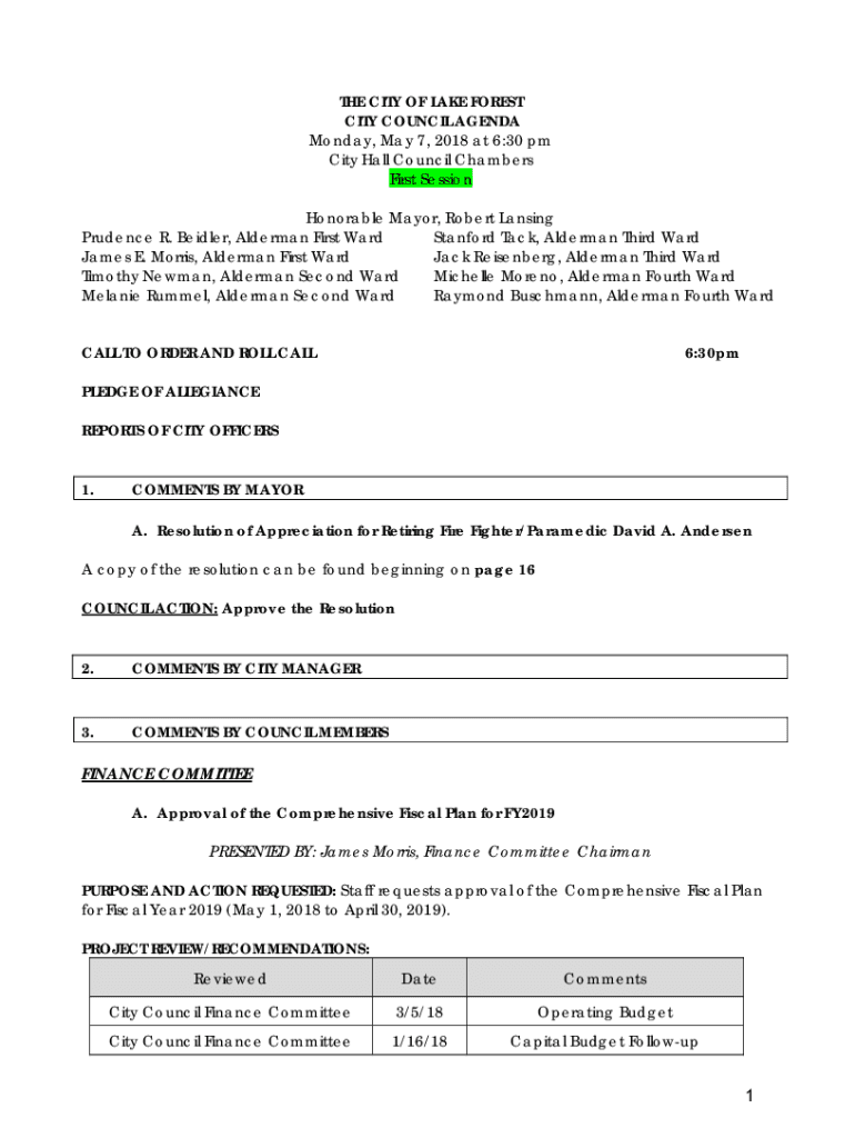THE CITY OF LAKE FOREST CITY COUNCIL AGENDA Monday, May 7, 2018, at 6:30 pm City Hall Council Chambers First Session Honorable Mayor, Robert Lansing Prudence R. Badger, Alderman First Ward Stanford