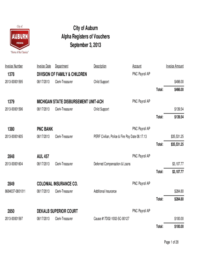 City of Auburn Alpha Registers of Vouchers September 3, 2013Invoice Number1378 201300001595Invoice DateDepartmentDescriptionClerkTreasurerInvoice Amount PNC Payroll DIVISION OF FAMILY & CHILDREN 08/17/2013AccountChild