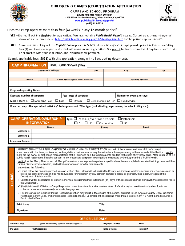 CHILDREN SCAMPS REGISTRATION APPLICATION CAMPS AND SCHOOL PROGRAMEnvironmental Health Division 1435 West Covina Parkway, West Covina, CA 91790 www.publichealth.lacounty.gov/eh (626) 8133428Does the
