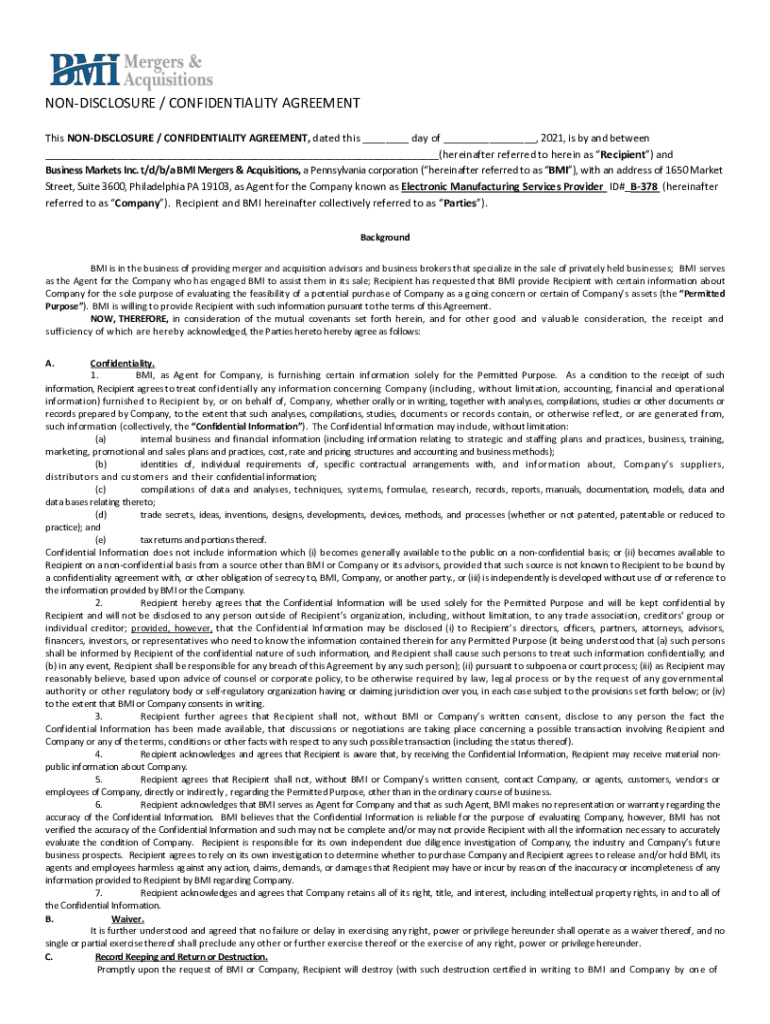 NONDISCLOSURE / CONFIDENTIALITY AGREEMENT This NONDISCLOSURE / CONFIDENTIALITY AGREEMENT, dated this ___ day of ___, 2021, is by and between ___(hereinafter referred to herein as Recipient) and Business