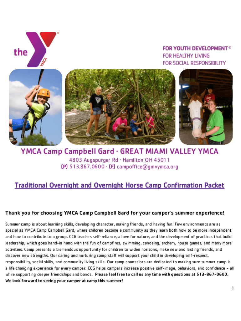 YMCA Camp Campbell Hard GREAT MIAMI VALLEY YMCA 4803 Augsburg Rd Hamilton OH 45011 (P) 513.867.0600 (E) campoffice@gmvymca.orgTraditional Overnight and Overnight Horse Camp Confirmation PacketThank