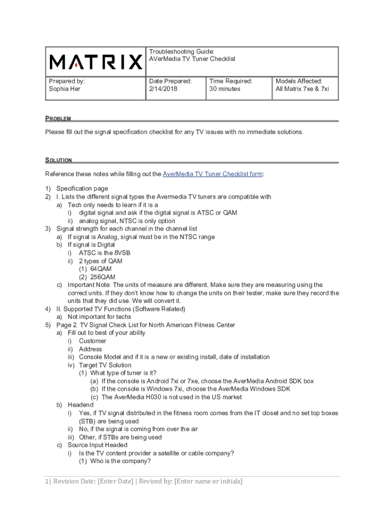 Troubleshooting Guide: Aver Media TV Tuner Checklist Prepared by: Sophia Her Date Prepared: 2/14/2018Time Required: 30 minutesModels Affected: All Matrix 7xe & 7xiPROBLEM Please fill out the signal