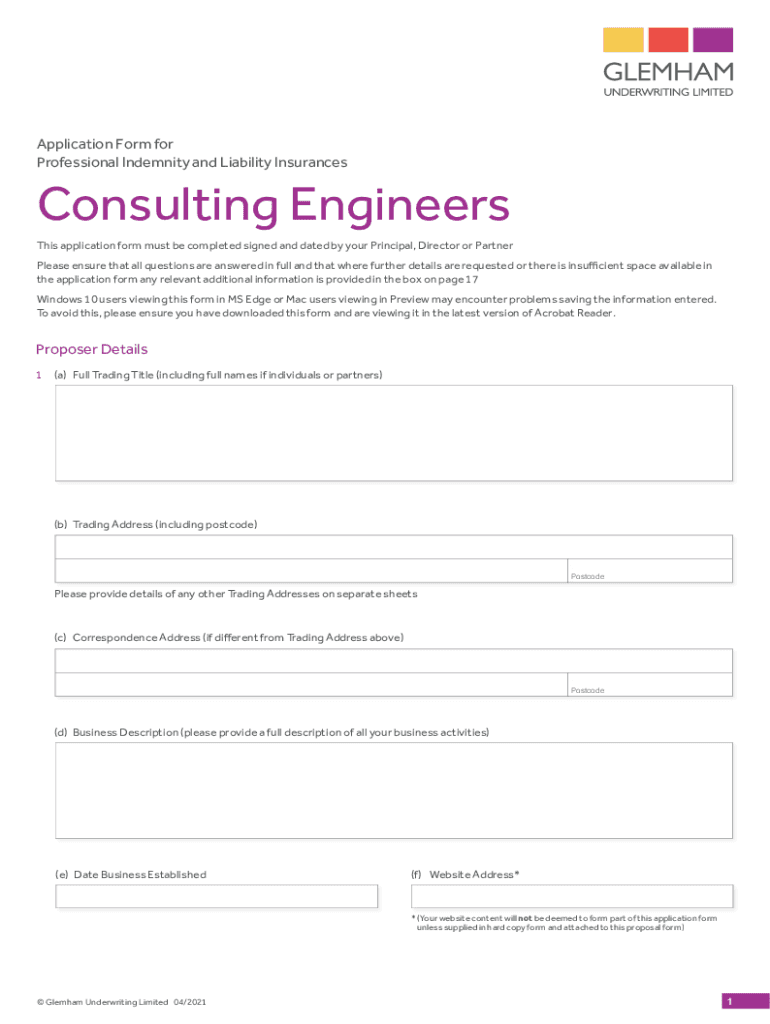 Application Form for Professional Indemnity and Liability InsurancesConsulting Engineers This application form must be completed signed and dated by your Principal, Director or Partner Please ensure