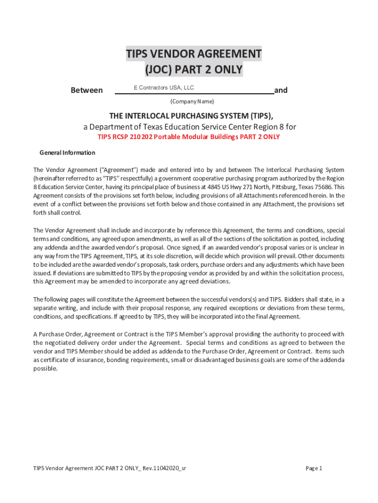 TIPS VENDOR AGREEMENT (JOC) PART 2 ONLY Between Contractors USA, LLC and(Company Name)THE INTERLOCK PURCHASING SYSTEM (TIPS), a Department of Texas Education Service Center Region 8 for TIPS RCMP
