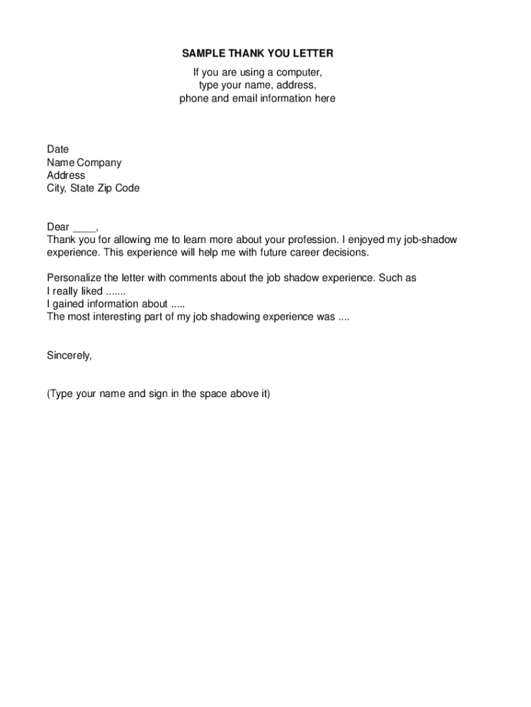 SAMPLE THANK YOU LETTER If you are using a computer, type your name, address, phone and email information hardware Name Company Address City, State Zip Code Dear ___, Thank you for allowing me to