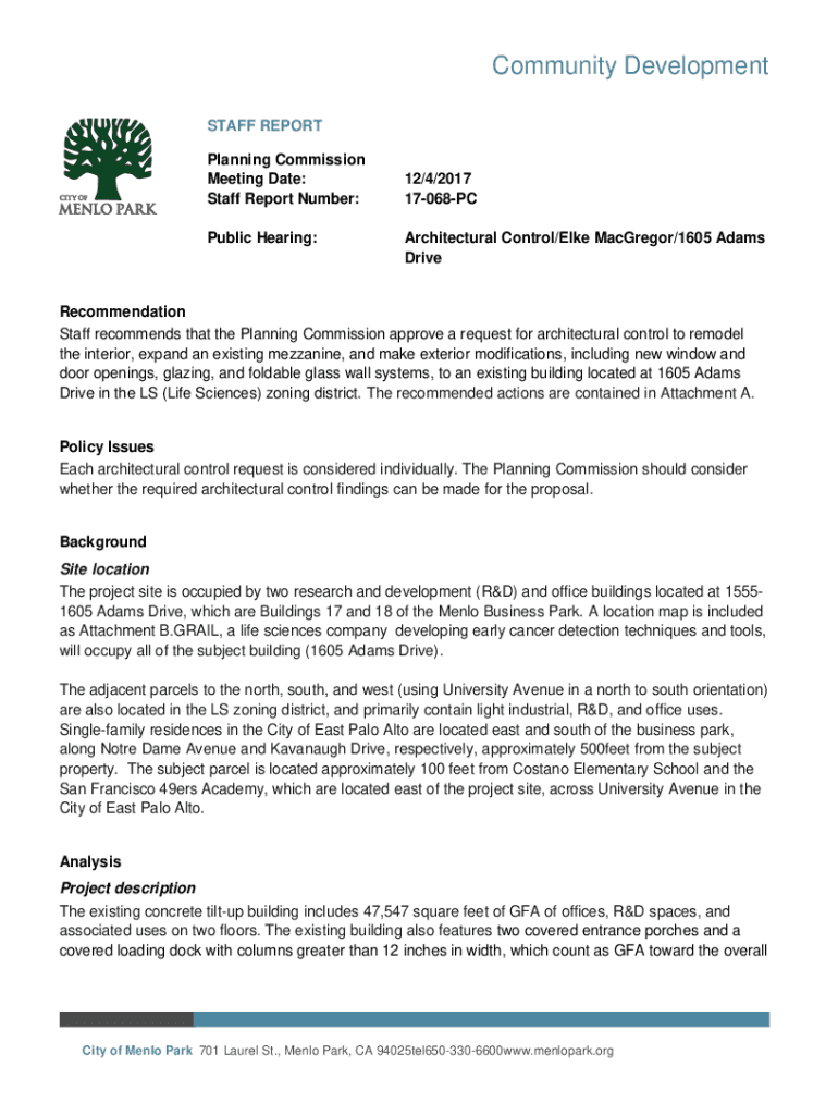 Community Development STAFF REPORT Planning Commission Meeting Date: Staff Report Number: Public Hearing:12/4/2017 17068PC Architectural Control/Else MacGregor/1605 Adams DriveRecommendation Staff