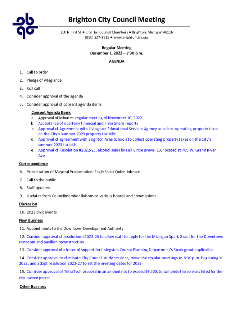 Brighton City Council Meeting 200 N First St City Hall Council Chambers Brighton, Michigan 48116 (810) 2271911 www.brightoncity.orgRegular Meeting December 1, 2022 7:30 p.m. AGENDA 1. Call to order