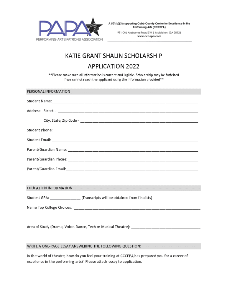 KATIE GRANT STALIN SCHOLARSHIP APPLICATION 2022 **Please make sure all information is current and legible. Scholarship may be forfeited if we cannot reach the applicant using the information provided**PERSONAL
