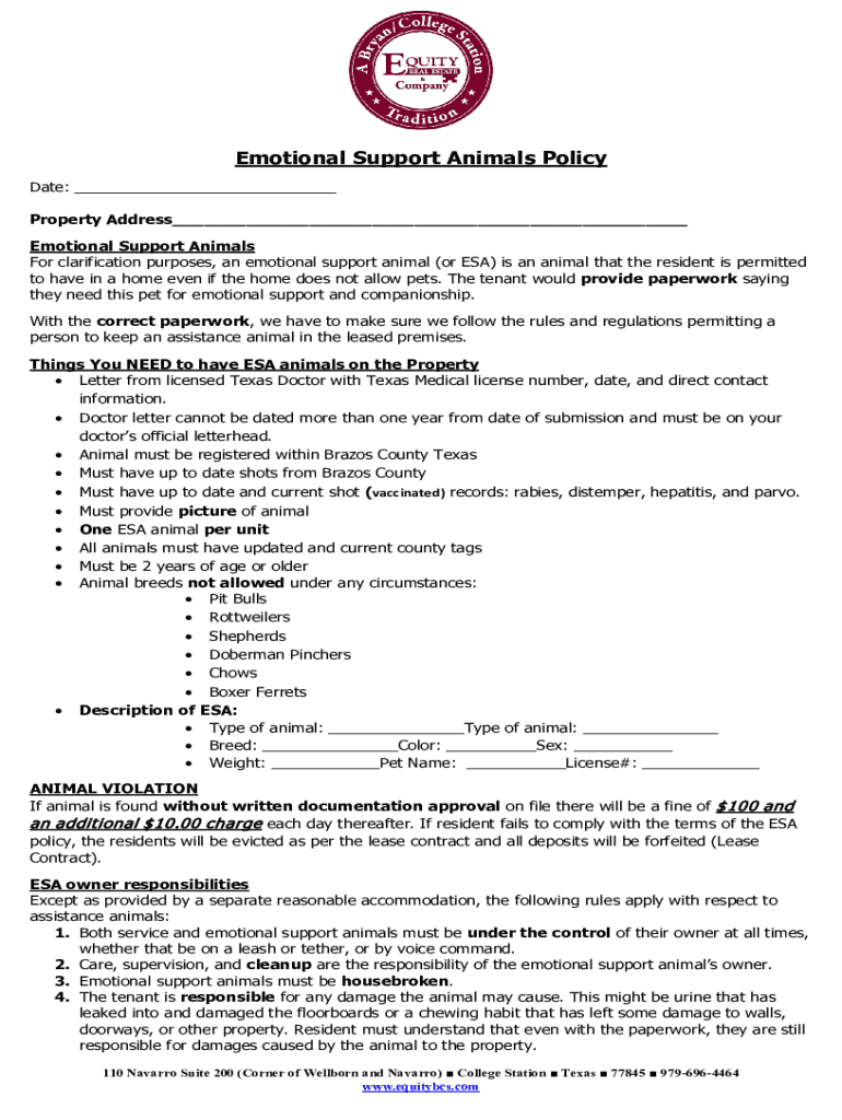 Emotional Support Animals Policy Date: ___ Property Address___ Emotional Support Animals For clarification purposes, an emotional support animal (or ESA) is an animal that the resident is permitted