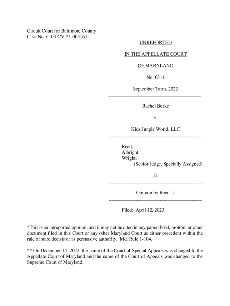 Circuit Court for Baltimore County Case No. C03CV21004164 UNREPORTED IN THE APPELLATE COURT OF MARYLAND No. 0311 September Term, 2022 ___ Rachel Burke v. Kids Jungle World, LLC ___ Reed, Albright,