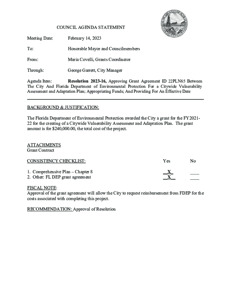COUNCIL AGENDA STATEMENT Meeting Date:February 14, 2023To:Honorable Mayor and CouncilmembersFrom:Maria Novella, Grants CoordinatorThrough:George Garrett, City ManagerAgenda Item: Resolution 202316,
