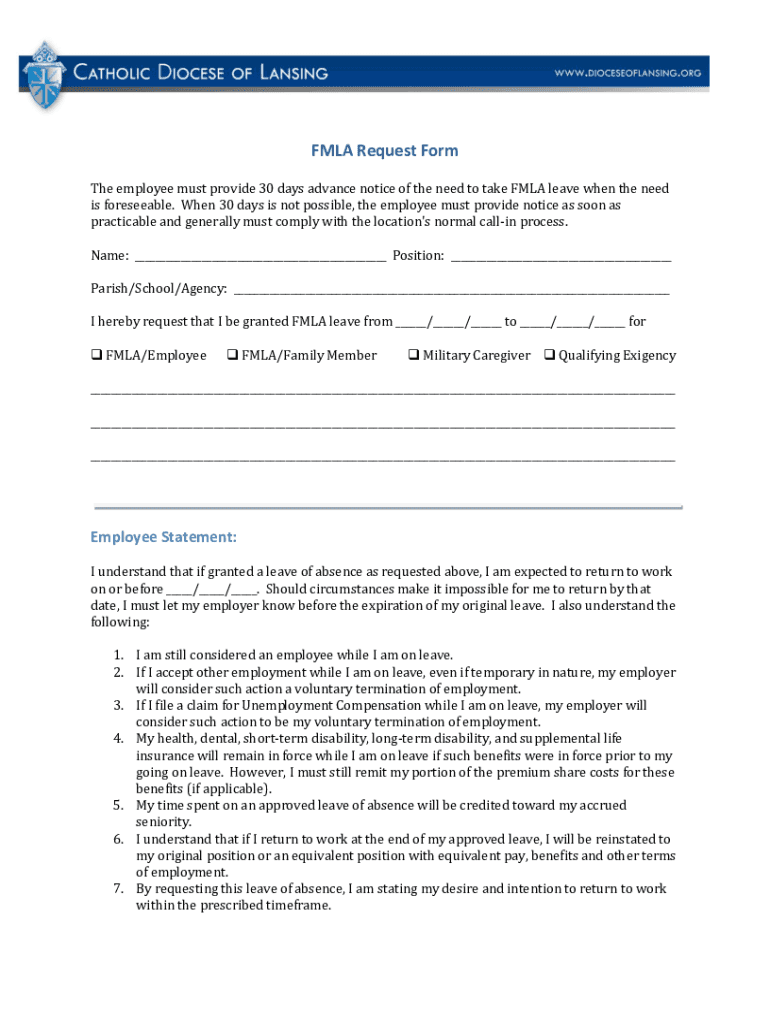 FMLA Request Form The employee must provide 30 days advance notice of the need to take FMLA leave when the need is foreseeable. When 30 days is not possible, the employee must provide notice as soon