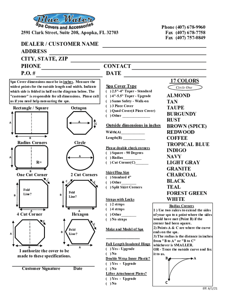 2591 Clark Street, Suite 208, Apopka, FL 32703Phone (407) 6789960 Fax (407) 6787758 Fax (407) 7570849DEALER / CUSTOMER NAME ADDRESS CITY, STATE, ZIP CONTACT PHONE P.O. # DATE Spa Cover dimensions