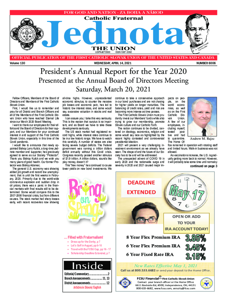 FOR GOD AND NATION ZA BOHR A non-Catholic FraternalJednotake URD NF r he is under p Ste FO Fr. Further UNION USA#273500ISSN10873392OFFICIAL PUBLICATION OF THE FIRST CATHOLIC SLOVAK UNION OF THE UNITED
