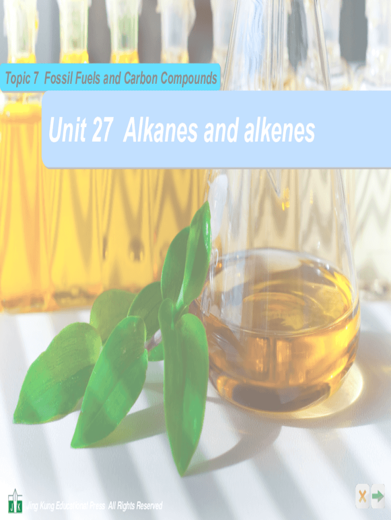 Topic 7 Fossil Fuels and Carbon CompoundsUnit 27 Alkanes and alkenes Jing King Educational Press All Rights Reserved2Unit 27 Alkanes and alkenesContent 27.1 Important reactions of alkanes 27.2 Demand