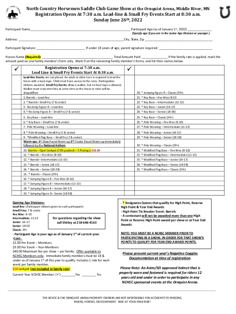 North Country Horsemen Saddle Club Game Show at the Request Arena, Middle River, MN Registration Opens At 7:30 a.m. Deadline & Small Fry Events Start at 8:30 a.m. Sunday, June 26th, 2022 Participant