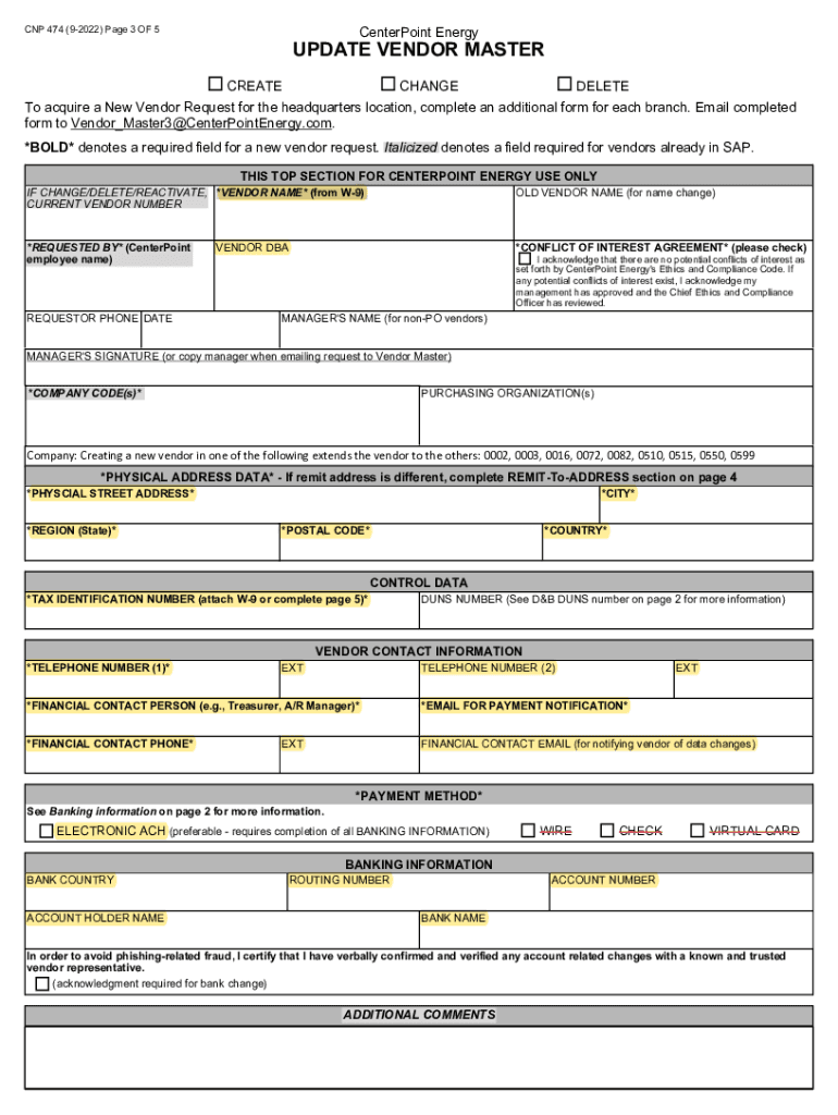 CNP 474 (92022) Page 3 OF 5CenterPoint EnergyUPDATE VENDOR MASTER CREATECHANGEDELETETo acquire a New Vendor Request for the headquarters location, complete an additional form for each branch. Email