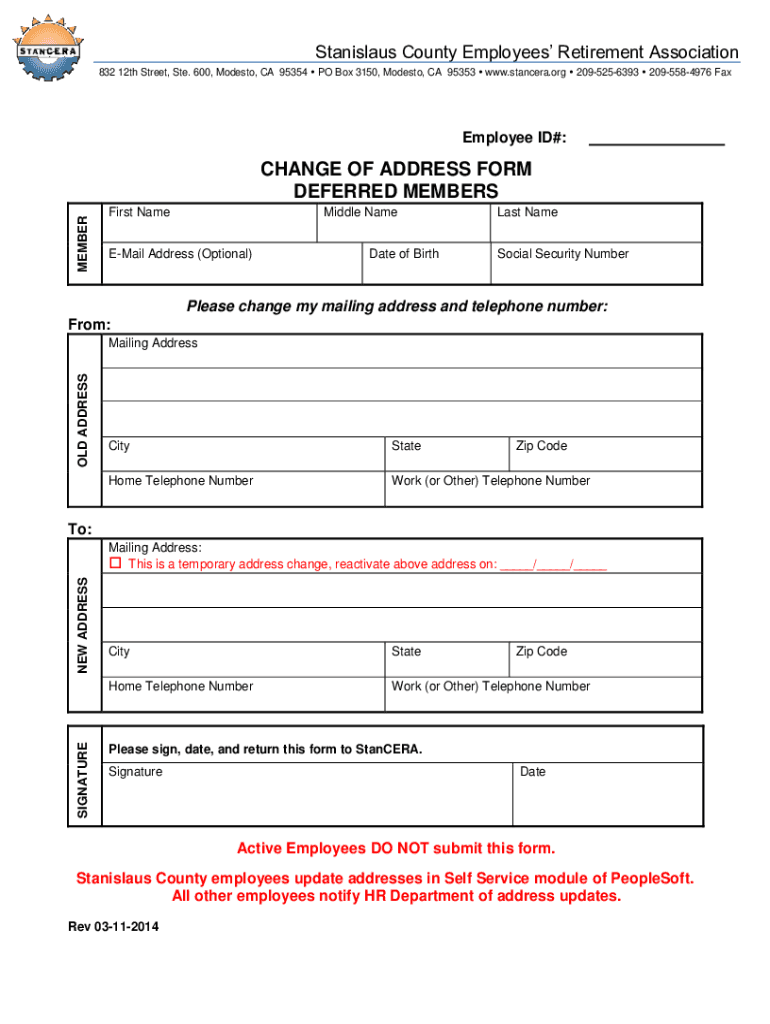 Stanislaus County Employees Retirement Association 832 12th Street, Ste. 600, Modesto, CA 95354 PO Box 3150, Modesto, CA 95353 www.stancera.org 2095256393 2095584976 Employee ID#:MEMBERCHANGE OF ADDRESS