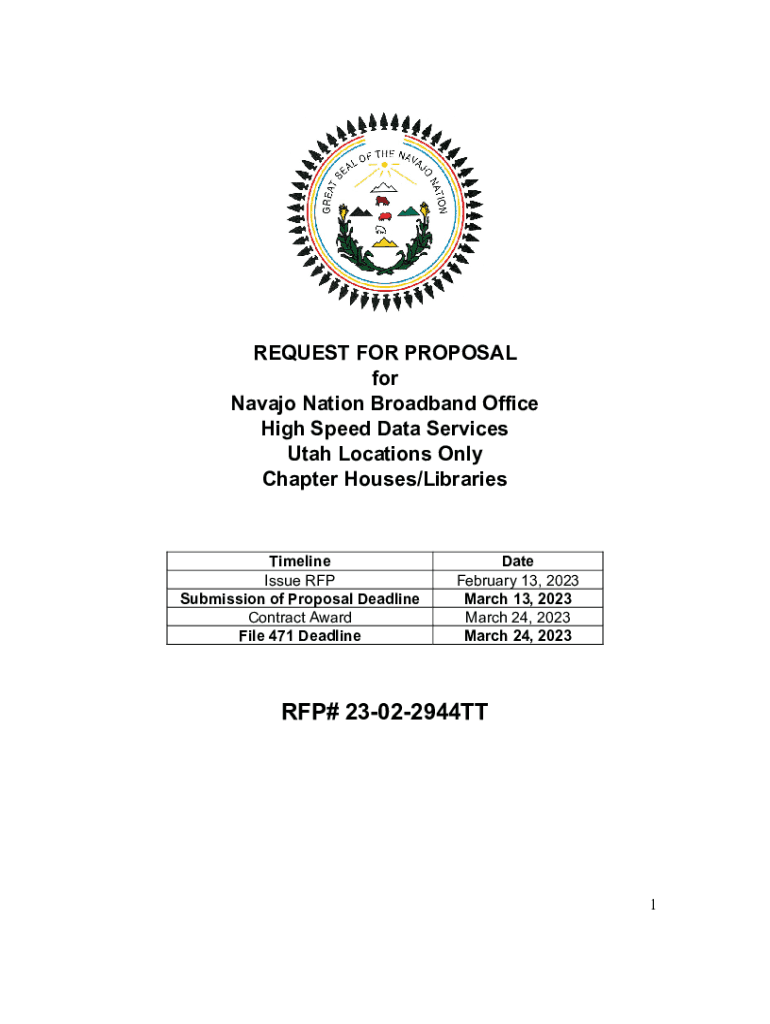REQUEST FOR PROPOSAL for Navajo Nation Broadband Office High Speed Data Services Utah Locations Only Chapter Houses/LibrariesTimeline Issue RFP Submission of Proposal Deadline Contract Award File