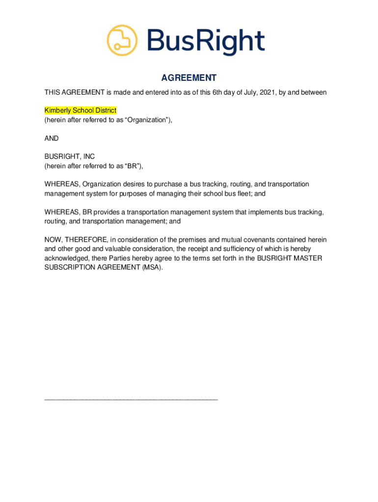 AGREEMENT THIS AGREEMENT is made and entered into as of this 6th day of July 2021, by and between Kimberly School District (herein after referred to as Organization), AND BRIGHT, INC (herein after