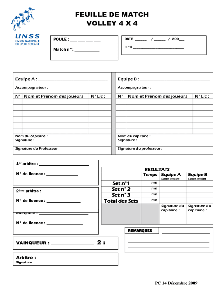 Obtenir le gratuit Feuille de Match Volley-Ball 4 X 4 Niveau dePDF
