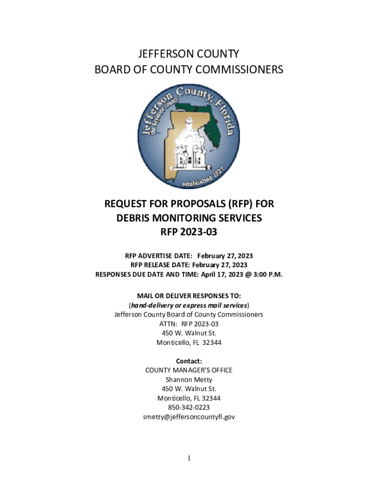 JEFFERSON COUNTY BOARD OF COUNTY COMMISSIONERSREQUEST FOR PROPOSALS (RFP) FOR DEBRIS MONITORING SERVICES RFP 202303 RFP ADVERTISE DATE: February 27, 2023, RFP RELEASE DATE: February 27, 2023, RESPONSES