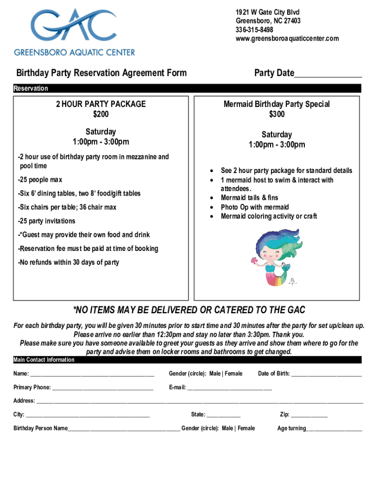 1921 W Gate City Blvd Greensboro, NC 27403 3363158498 www.greensboroaquaticcenter.comBirthday Party Reservation Agreement Forepart Date___Reservation2 HOUR PARTY PACKAGE $200Mermaid Birthday Party