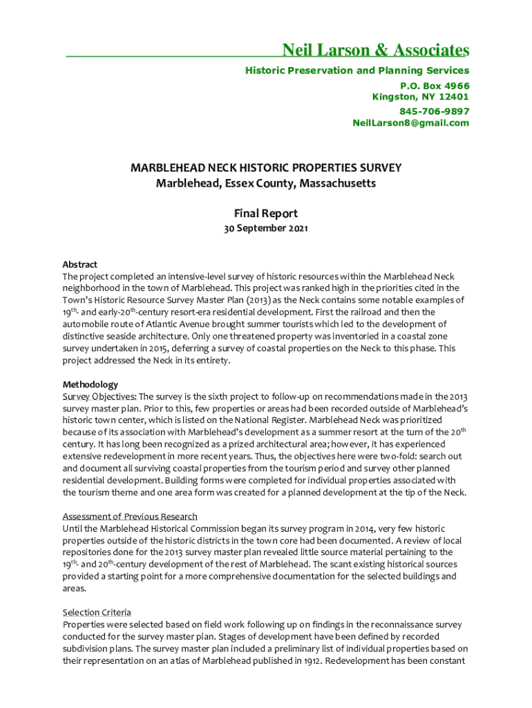 Neil Larson & Associates Historic Preservation and Planning Services P.O. Box 4966 Kingston, NY 12401 8457069897 NeilLarson8@gmail.comMARBLEHEAD NECK HISTORIC PROPERTIES SURVEY Marblehead, Essex County,