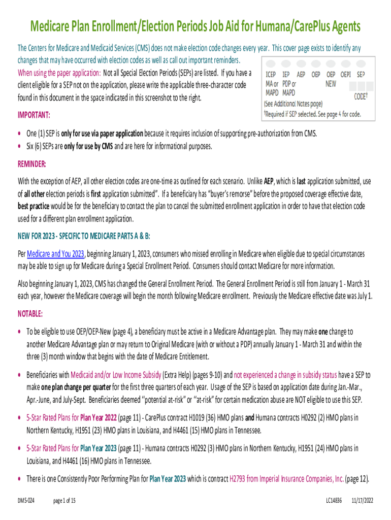 Medicare Plan Enrollment/Election Periods Job Aids for Human/Carpus Agents The Centers for Medicare and Medicaid Services (CMS) does not make election code changes every year. This cover page exists