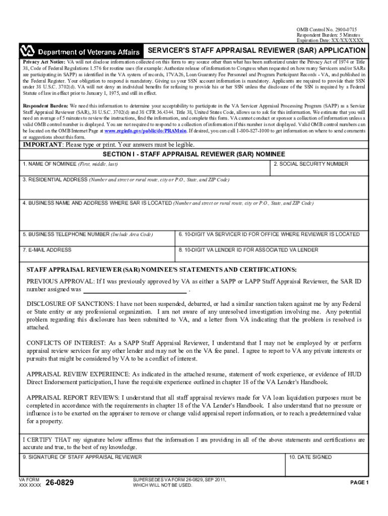 OMB Control No. 29000715 Respondent Burden: 5 Minutes Expiration Date: XX/XX/XXXXSERVICER\'S STAFF APPRAISAL REVIEWER (SAR) APPLICATION Privacy Act Notice: VA will not disclose information collected