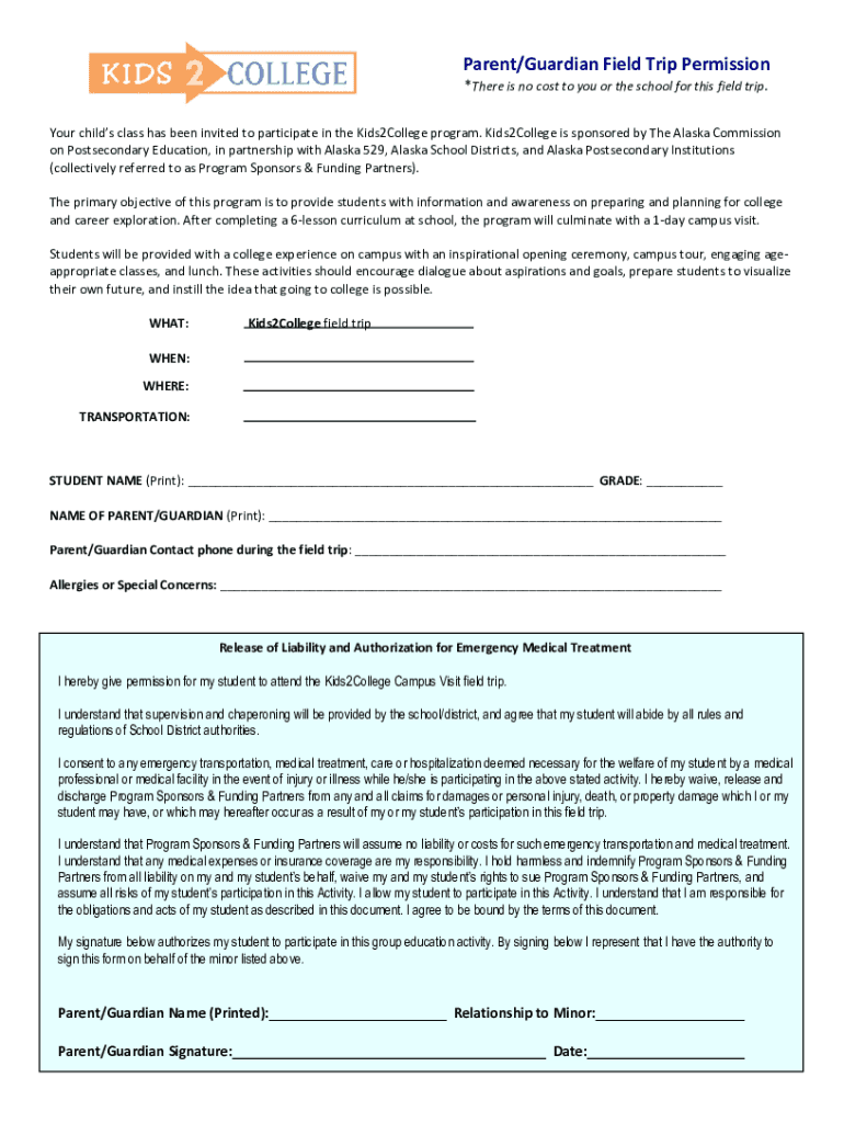 Get the free K2C Permission Slip Template (Word). Campus Visit