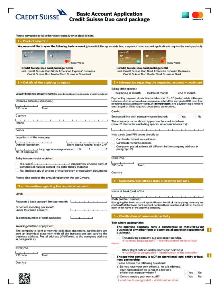 Basic Account Application Credit Suisse Duo card package Please complete in full either electronically or in block letters.1 Product selection Yes, we would like to open the following basic account