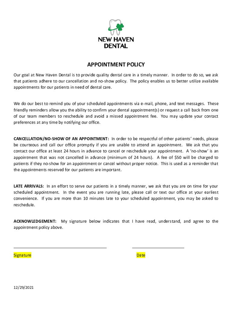 APPOINTMENT POLICY Our goal at New Haven Dental is to provide quality dental care in a timely manner. In order to do so, we ask that patients adhere to our cancellation and nohow policy. The policy