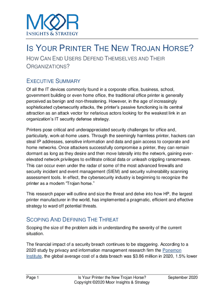 IS YOUR PRINTER THE NEW TROJAN HORSE? HOW CAN END USERS DEFEND THEMSELVES AND THEIR ORGANIZATIONS? EXECUTIVE SUMMARY Of all the IT devices commonly found in a corporate office, business, school, government