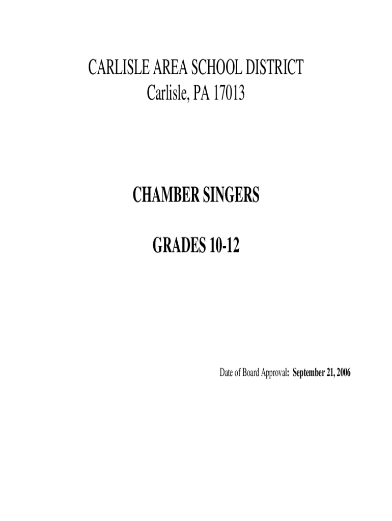 CARLISLE AREA SCHOOL DISTRICT Carlisle, PA 17013CHAMBER SINGERS GRADES 1012Date of Board Approval: September 21, 2006CARLISLE AREA SCHOOL DISTRICT PLANNED INSTRUCTION COVER PAGE Title of Course: Chamber