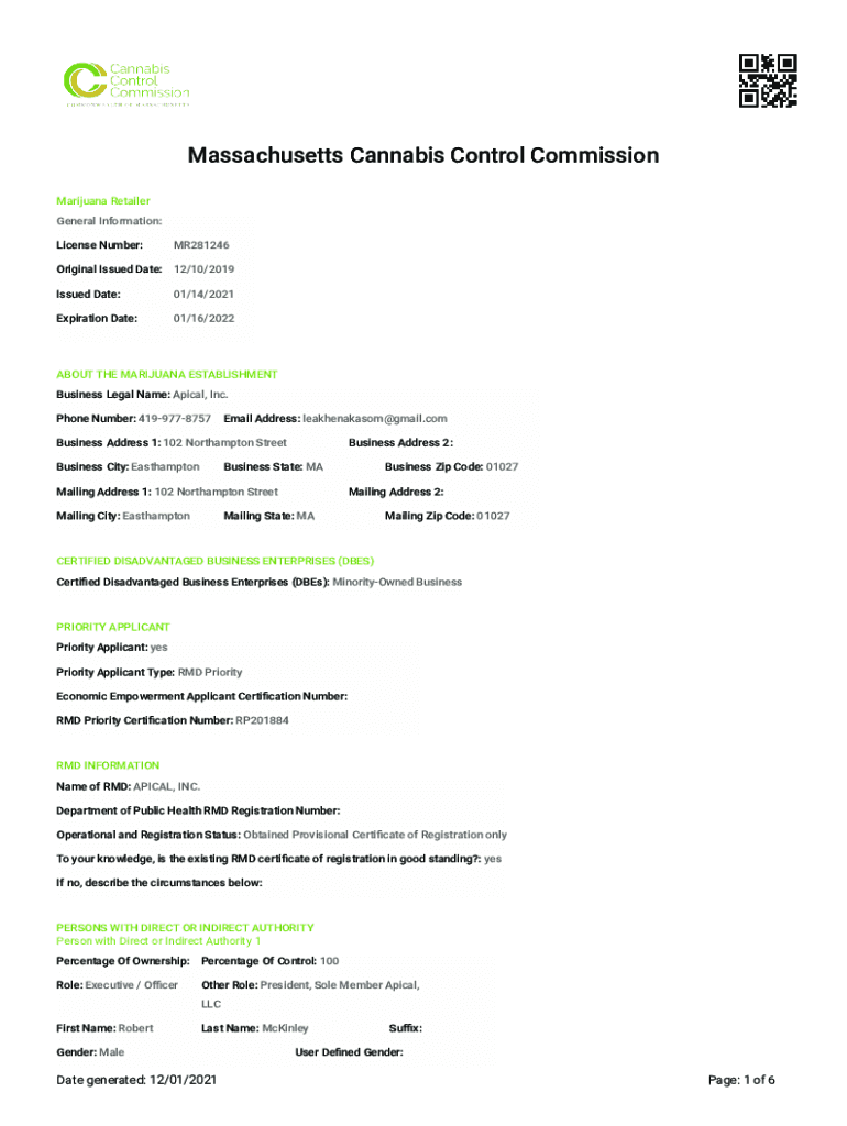 Massachusetts Cannabis Control Commission Marijuana Retailer General Information: License Number:MR281246Original Issued Date: 12/10/2019 Issued Date:01/14/2021Expiration Date:01/16/2022ABOUT THE
