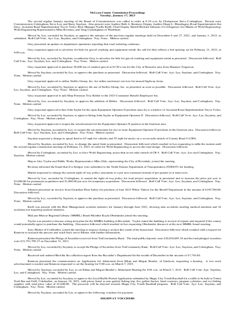 McLean County Commission Proceedings Tuesday, January 17, 2023, The second regular January meeting of the Board of Commissioners was called to order at 8:30 a.m. by Chairperson Steve Nottingham. Present
