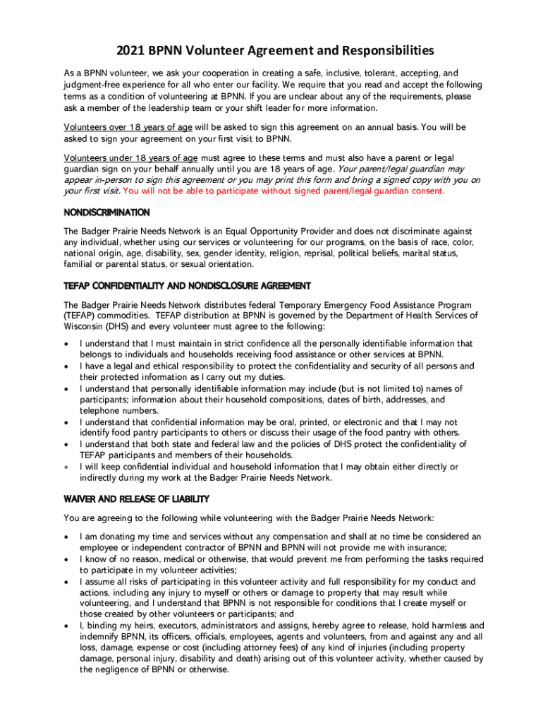 2021 BONN Volunteer Agreement and Responsibilities As a BONN volunteer, we ask your cooperation in creating a safe, inclusive, tolerant, accepting, and judgment free experience for all who enter our