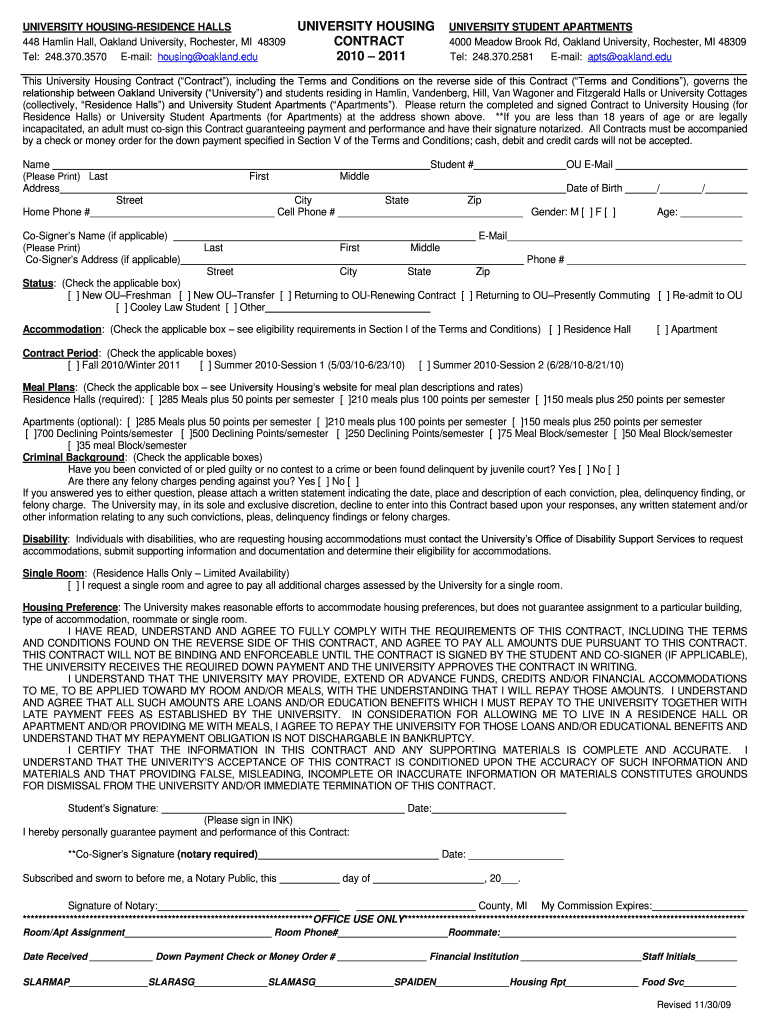 This contract governs the relationship between Oakland University and students residing in university housing. It outlines the terms and conditions, eligibility, responsibilities, and the necessary