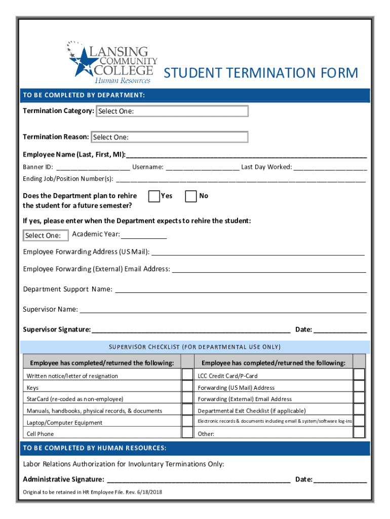 The form typically requires basic information about the student, the reason for termination, and any relevant signatures.