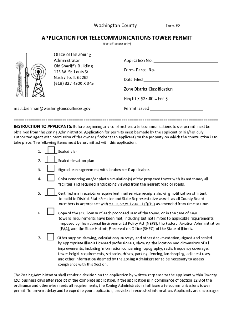 Washington Conform #2APPLICATION FOR TELECOMMUNICATIONS TOWER PERMIT (For office use only)Office of the Zoning Administrator Old Sheriffs Building 125 W. St. Louis St. Nashville, IL 62263 (618) 3274800