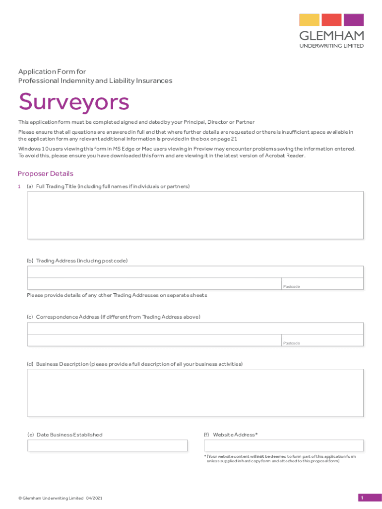 Application Form for Professional Indemnity and Liability InsurancesSurveyors This application form must be completed signed and dated by your Principal, Director or Partner Please ensure that all