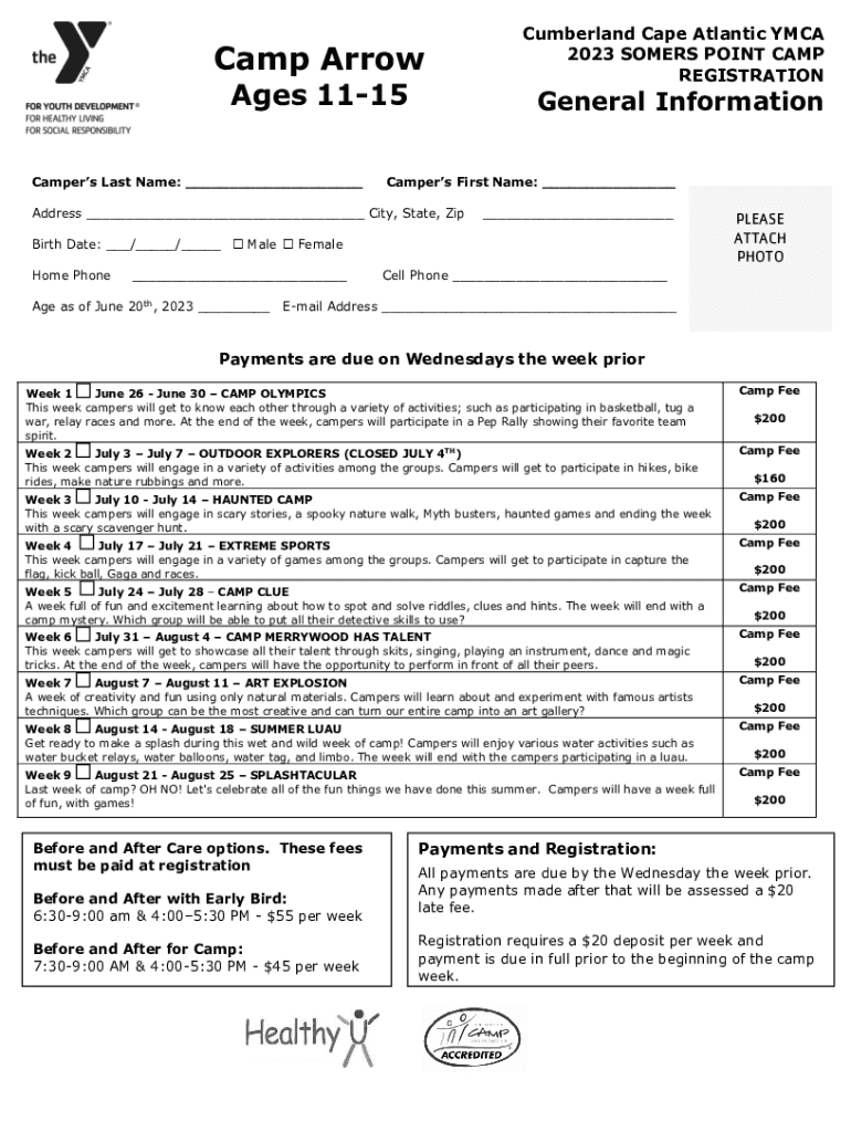 Camp Arrow Ages 1115 Campers Last Name: ___Cumberland Cape Atlantic YMCA 2023 HOMERS POINT CAMP REGISTRATIONGeneral InformationCampers First Name: ___Address ___ City, State, Zip___Birth Date: ___/___/___
