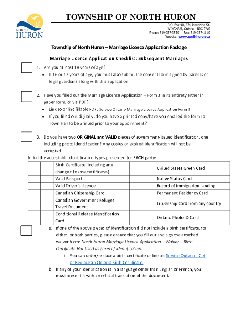 TOWNSHIP OF NORTH HURON P.O. Box 90, 274 Josephine St. GINGHAM, Ontario N0G 2W0 Phone: 5193573550 Fax: 5193571110 Website: www.northhuron.caTownship of North Huron Marriage License Application Package