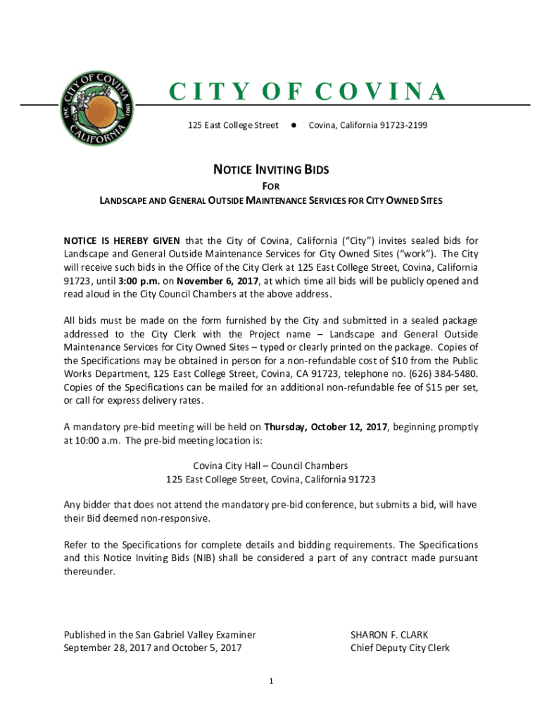 CITY OF CORINA 125 East College Street Corina, California 917232199 www.covinaca.govNOTICE INVITING BIDS FOR LANDSCAPE AND GENERAL OUTSIDE MAINTENANCE SERVICES FOR CITY OWNED SITES NOTICE IS HEREBY