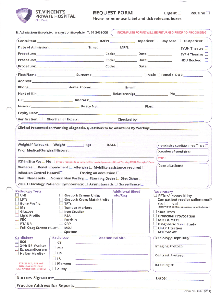 Please print or use label and tick relevant boxes:IRoutineAdmissions@svph.i.e., xraysvph@svph.ie T: 01 2638000InpatientConsultant:
