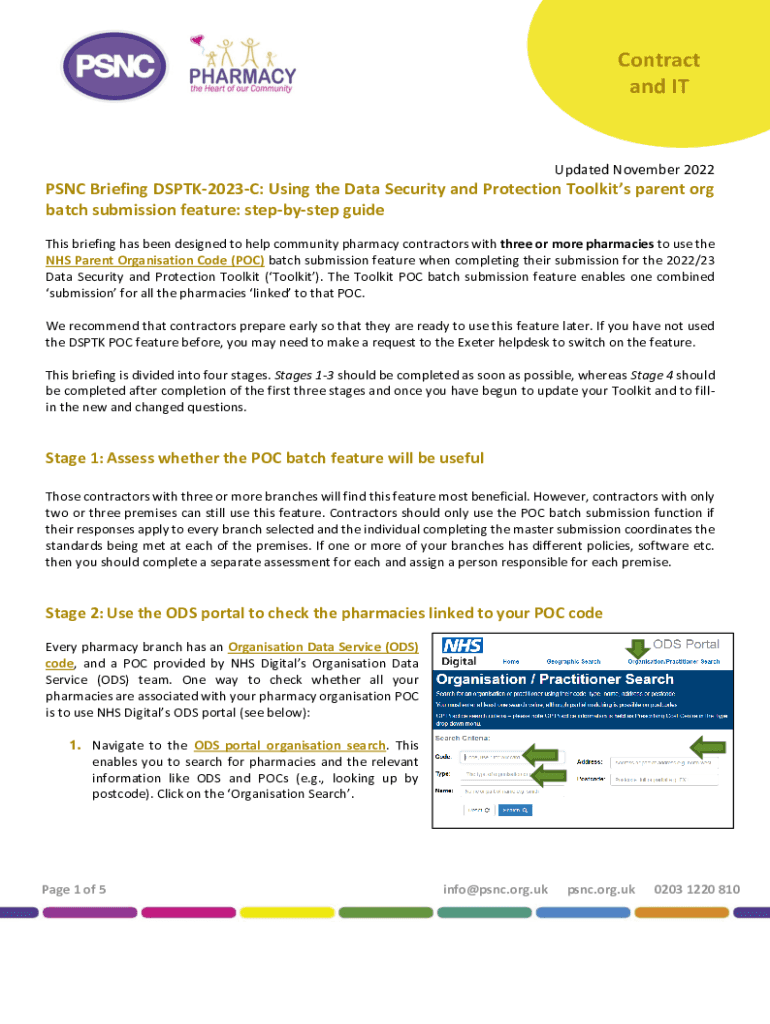Contract and Updated November 2022PSNC Briefing DSPTK2023C: Using the Data Security and Protection Toolkits parent org batch submission feature: stepsister guide This briefing has been designed to