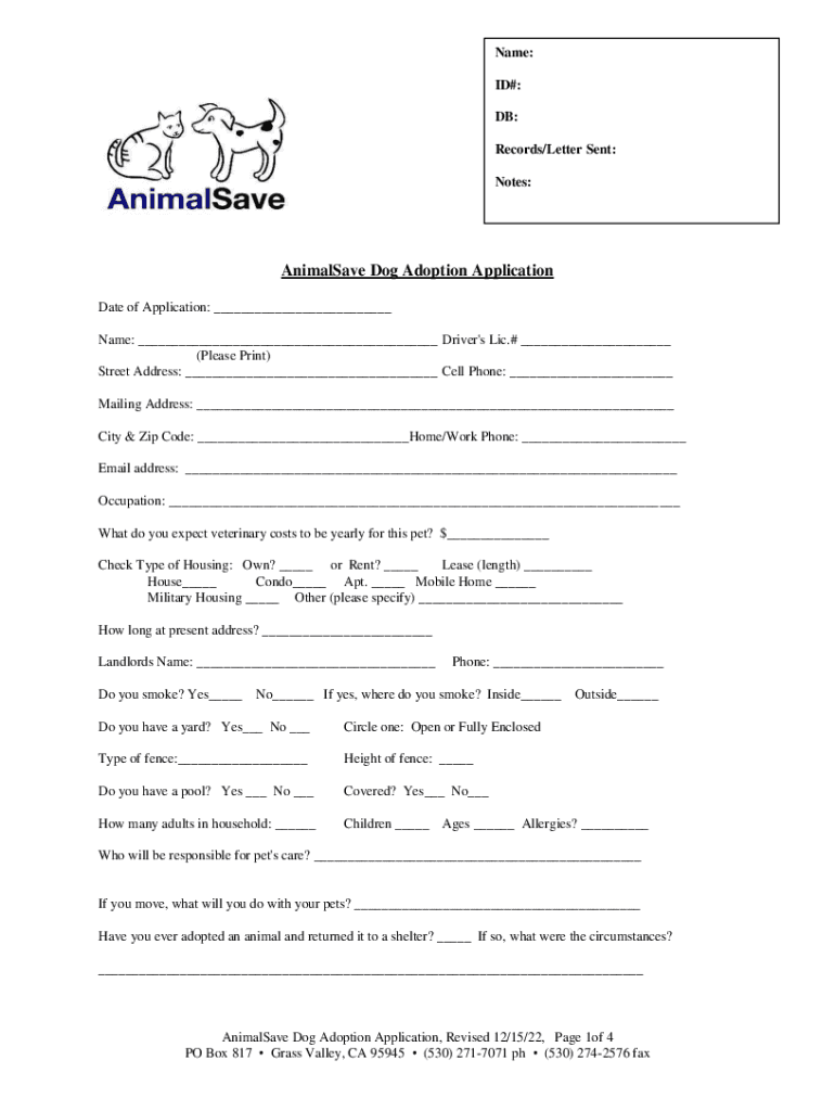 Name: ID#: DB: Records/Letter Sent: Notes:Animal Save Dog Adoption Application Date of Application: ___ Name: ___ Driver\'s LIC.# ___ (Please Print) Street Address: ___ Cell Phone: ___ Mailing Address: