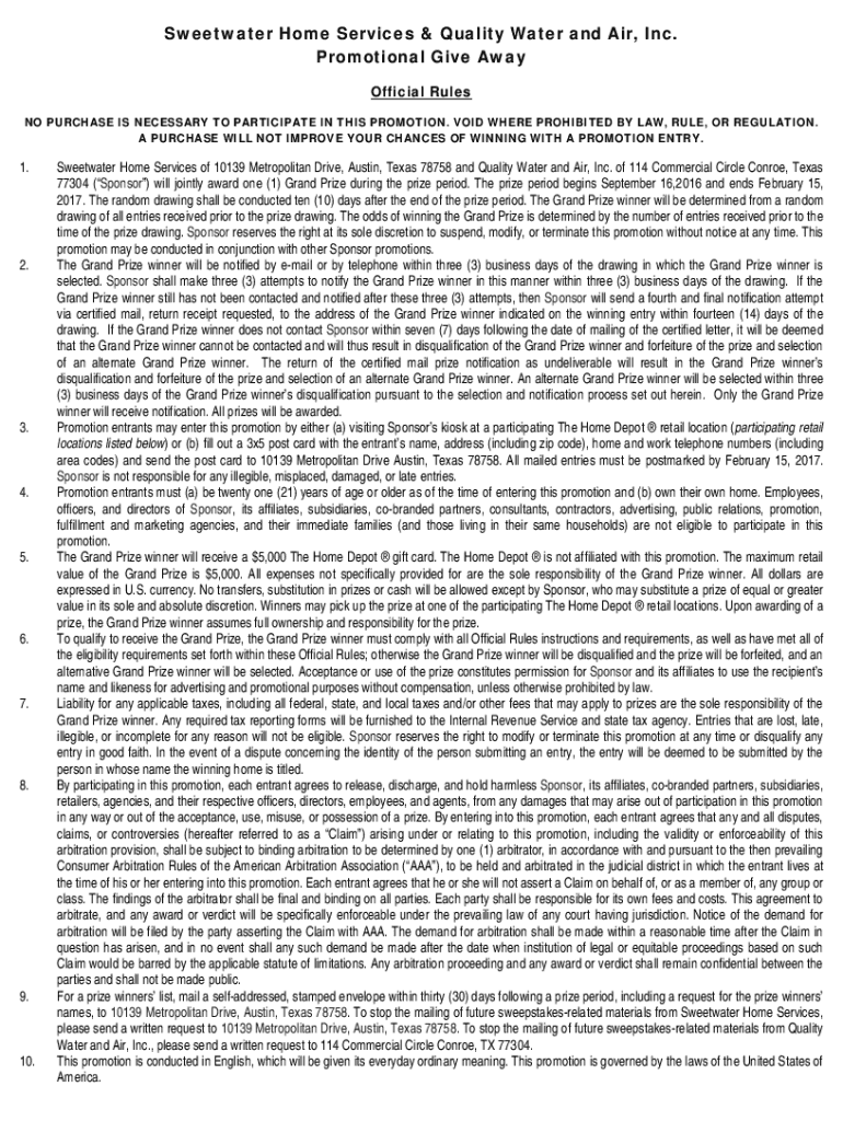 Sweetwater Home Services & Quality Water and Air, Inc. Promotional Give Away Official Rules NO PURCHASE IS NECESSARY TO PARTICIPATE IN THIS PROMOTION. VOID WHERE PROHIBITED BY LAW, RULE, OR REGULATION.