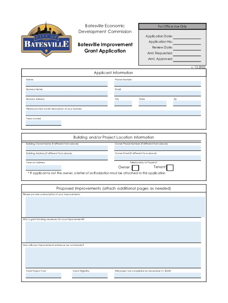 2023 Building Improvement Grant Batesville Economic Development Commission Guidelines and Application About the Program: The City of Batesville Building Improvement Grant (BIG) provides matching funds